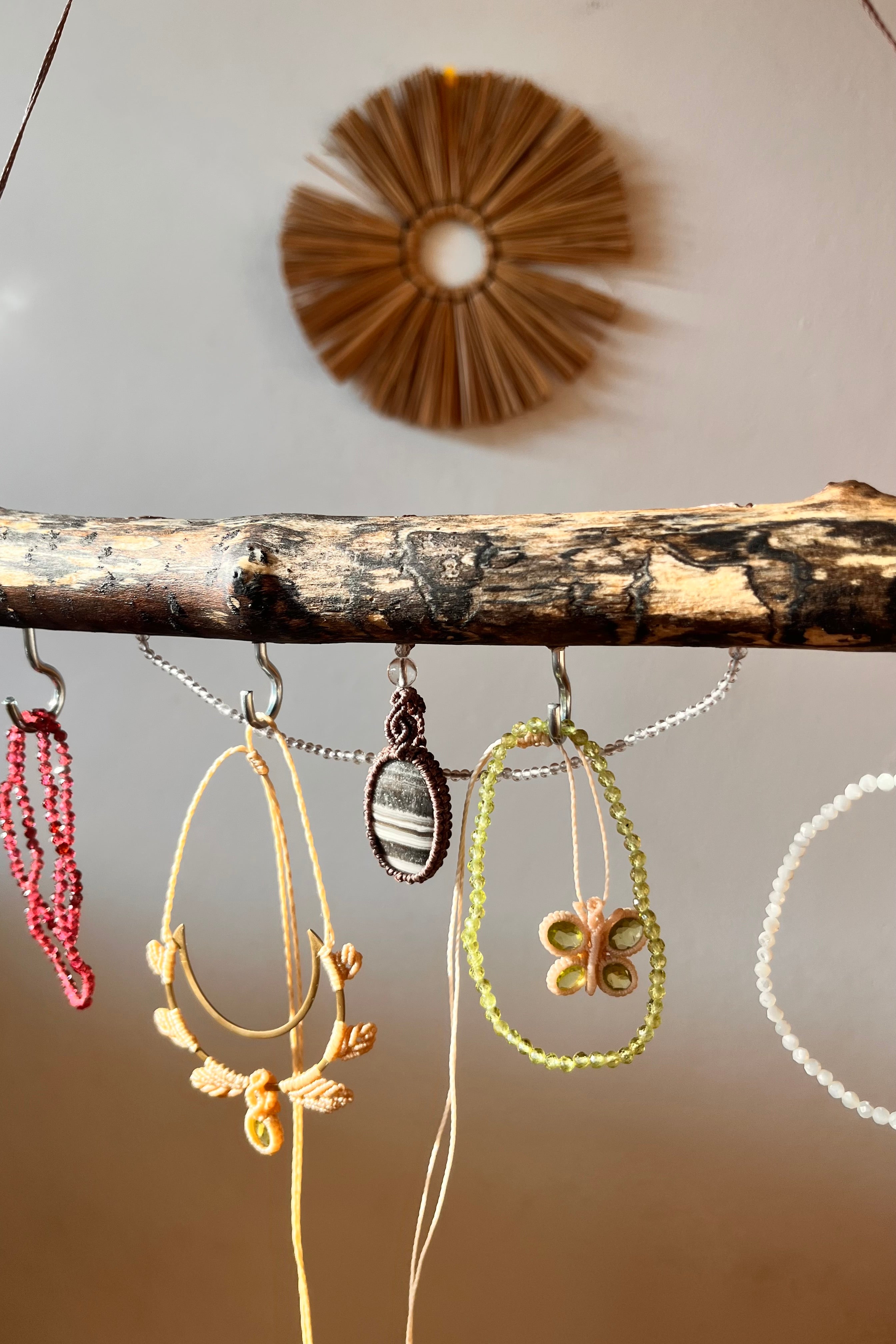 Genau deshalb habe ich den Erlenasthänger - aus Erlenholz, Makramee und Schmucksteinen entworfen & umgesetzt - damit all diese Dinge, wie Schmuckstücke, von Armbändern, über Ketten, Ohrringe, Schlüssel oder Geldbeutel sowie Taschen mit dünnen Henkeln etc. ihren Platz finden dürfen. 🤎