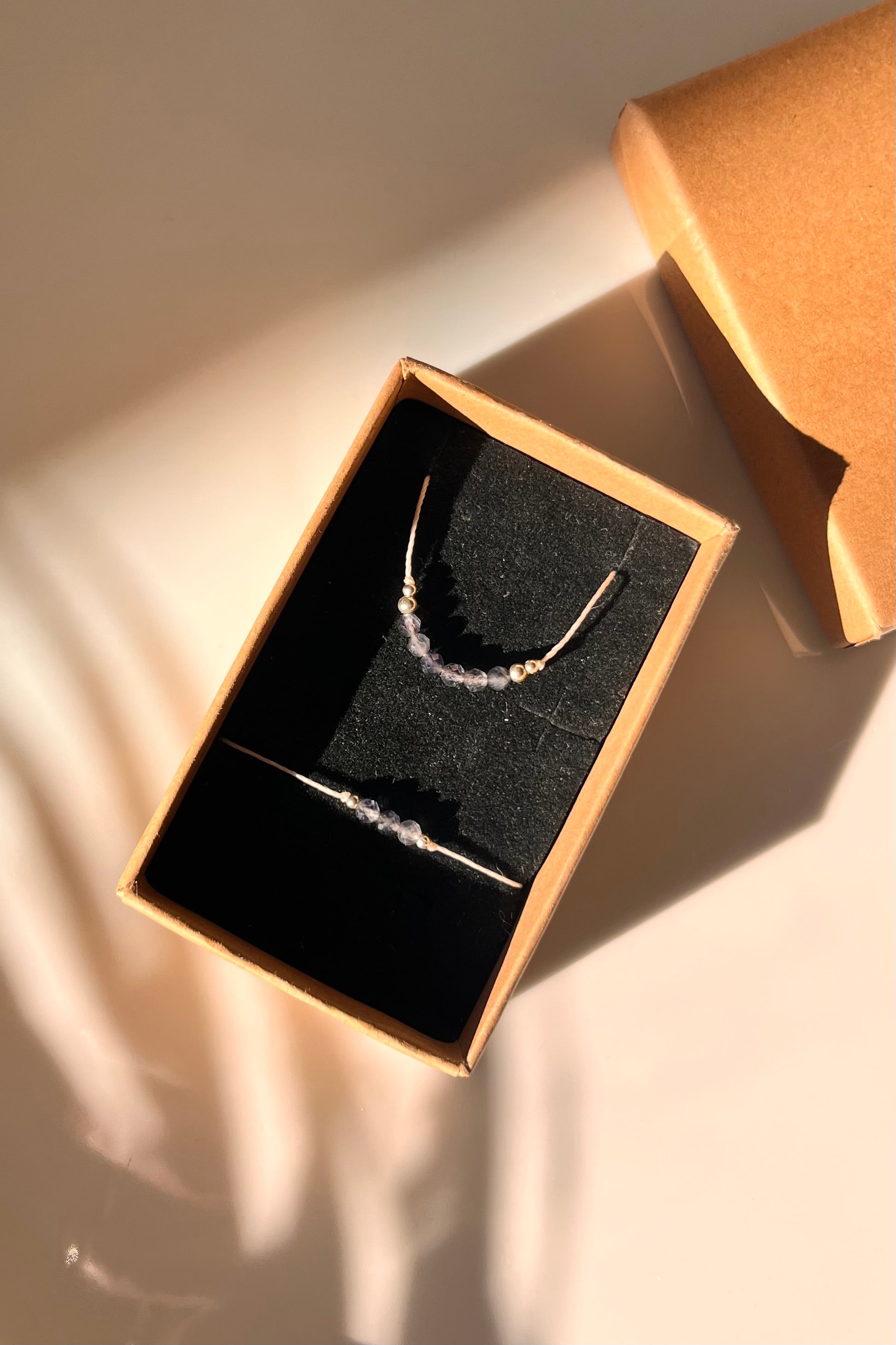 Facettiertes Iolith Makramee Schmuckset (Kette + Armband)